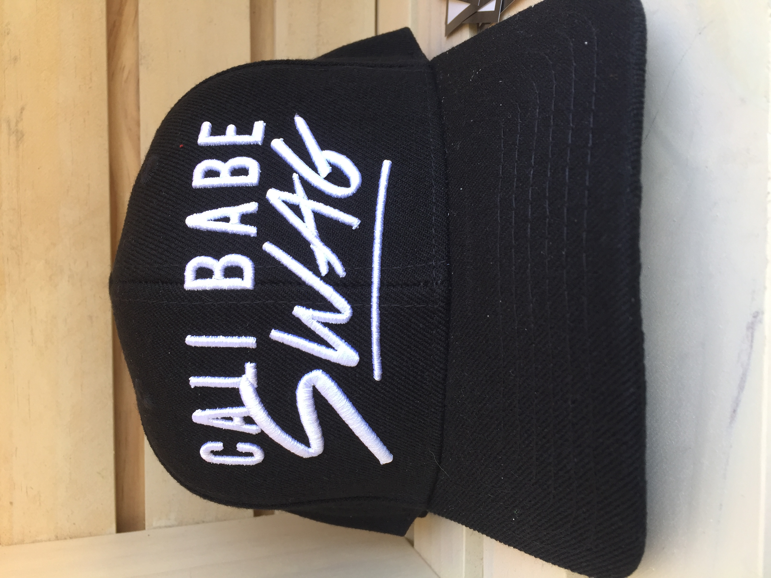 Cali Babe Youth Baseball style black SnapBack hat with white "Cali Babe Swag" puff embroidered.